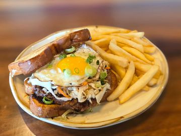 Braised and teppan-grilled pork belly with a sunny-side-up egg on Texas toast, topped with Asian sesame slaw and finished with our signature pork belly sauce.